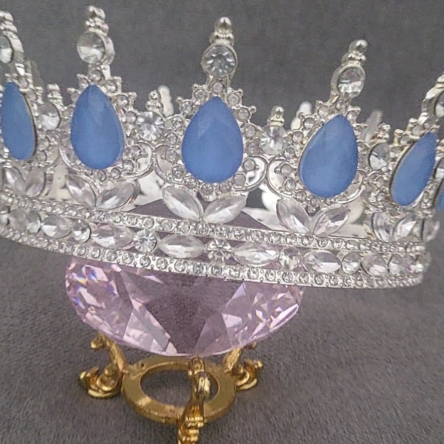 corona 40cm de redonda por 5cm de alta, base plateada con toques azul claro mate, material fantasía fina con incrustacion de cristales checos
