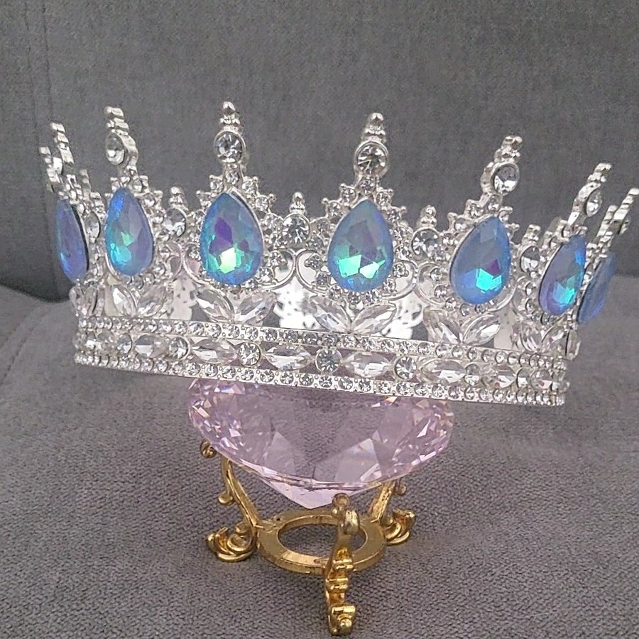 corona 40cm de redonda por 5cm, base plateada con toques azul claro tornasol, material fantasía fina con incrustacion de cristales checos