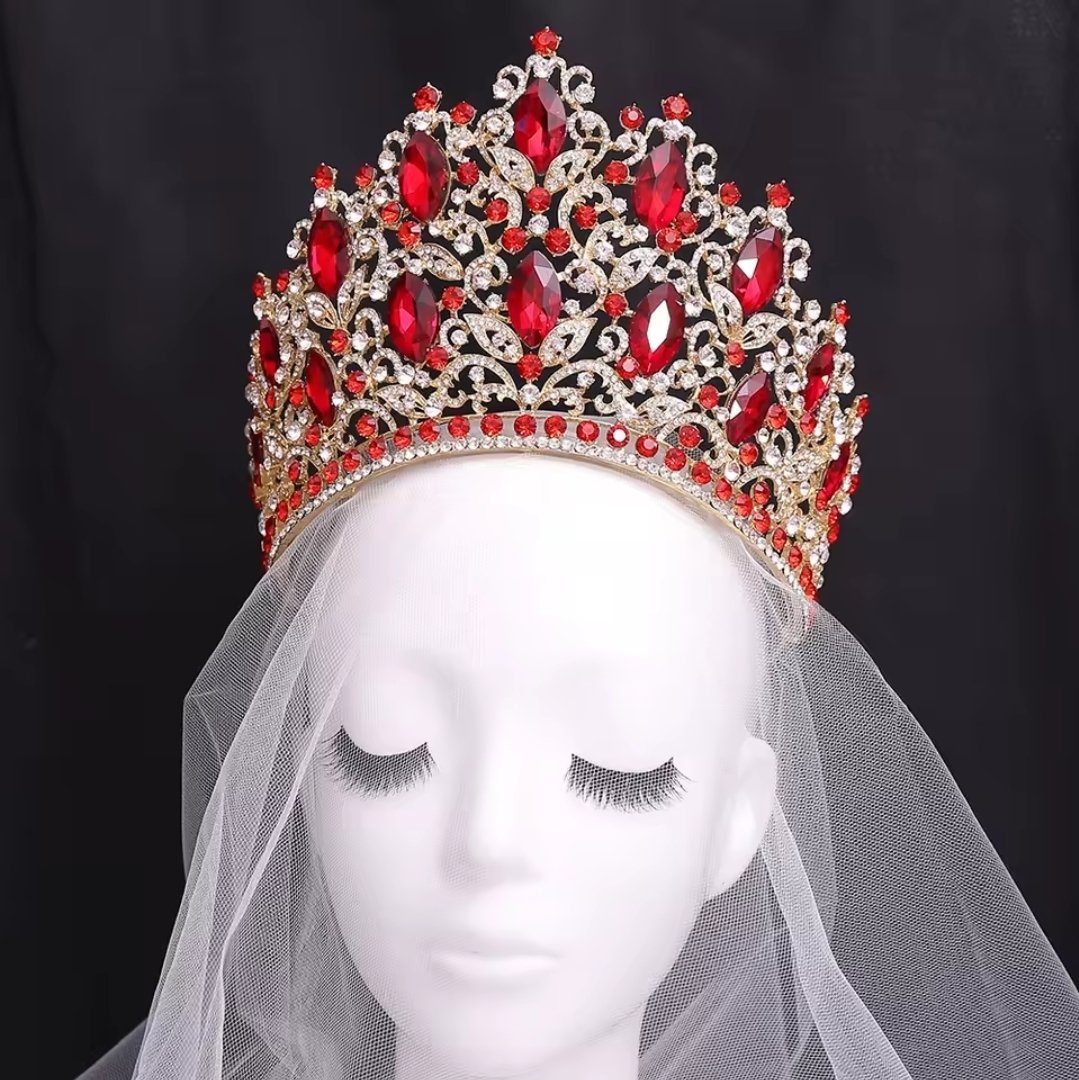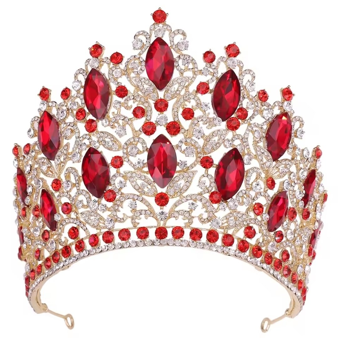 tiara alta base dorada con toques rojo, 14cm de alta, material fantasía fina con incrustacion de cristales checos