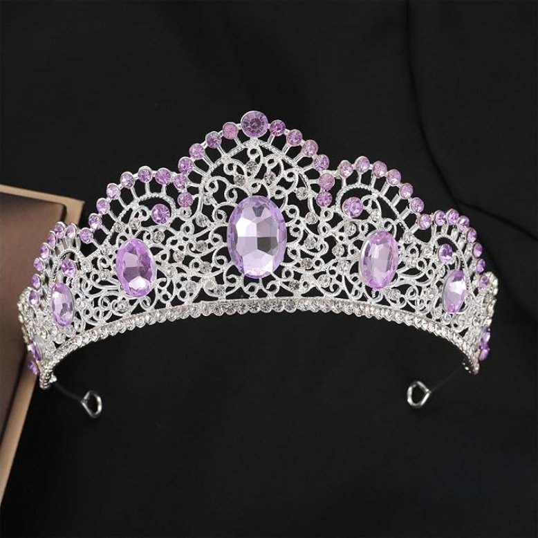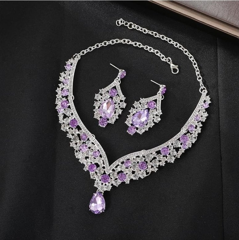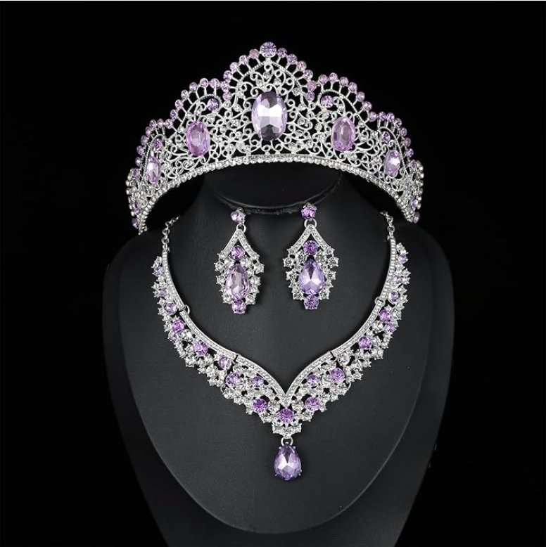 set de tiara y collar con aretes base plateada con toques lila, material fantasía fina con incrustacion de cristales checos