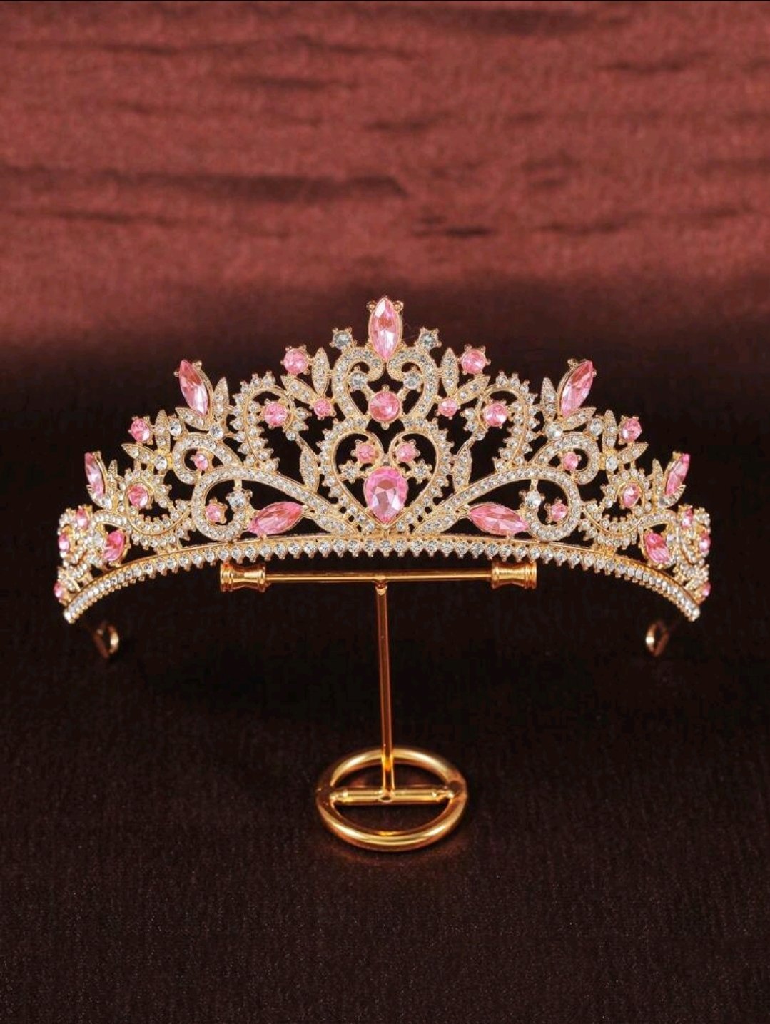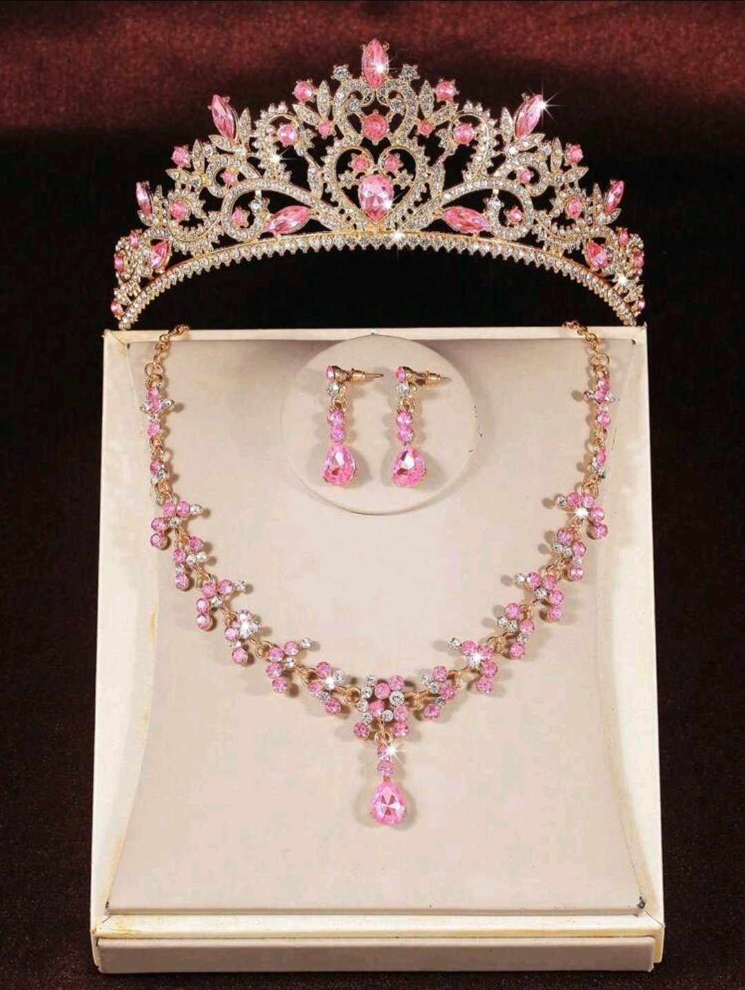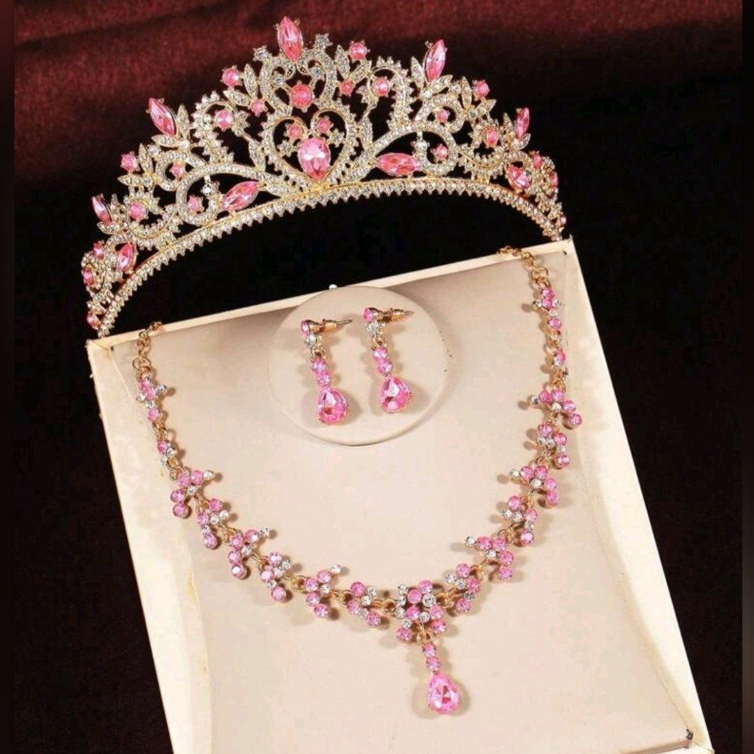 tiara y collar con aretes base dorada con toques rosa, material fantasía fina con incrustacion de cristales checos, 6.5cm de alta