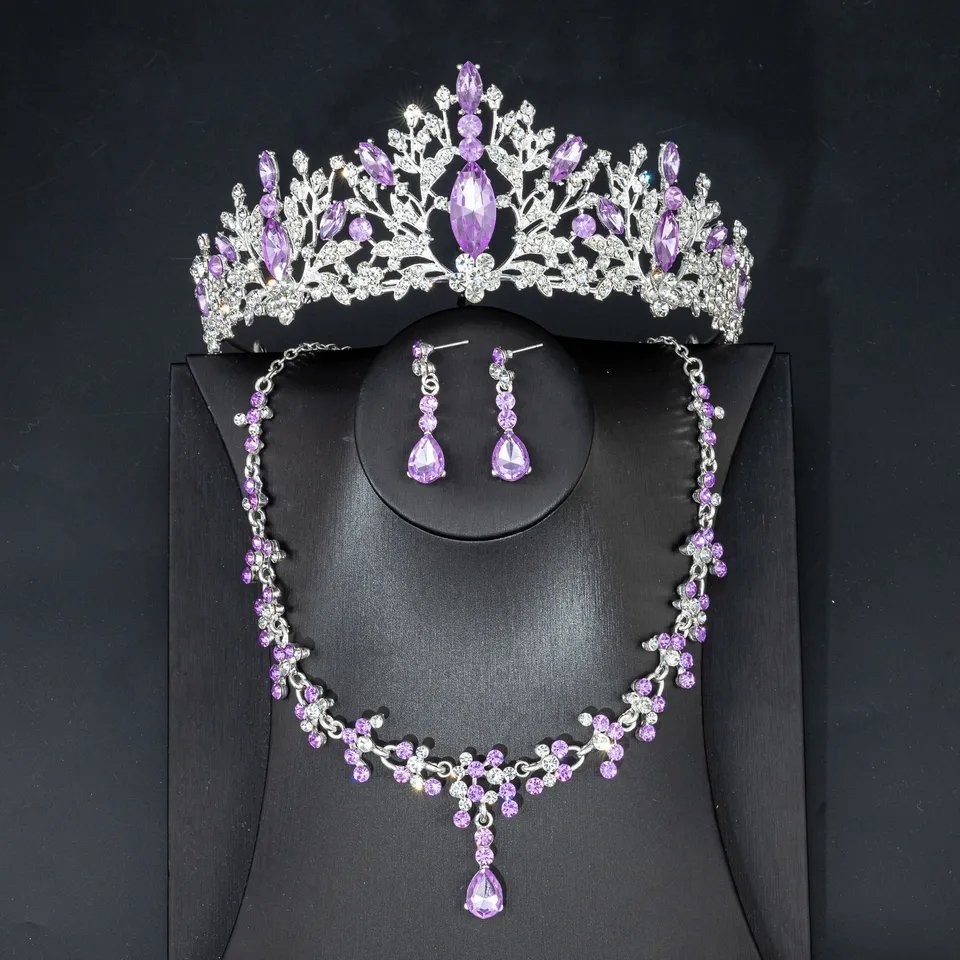 tiara y collar con aretes, base plateada con toques lila,material fantasía fina con incrustacion de cristales checos