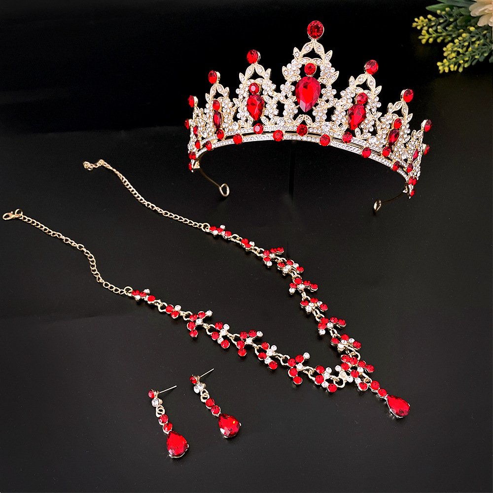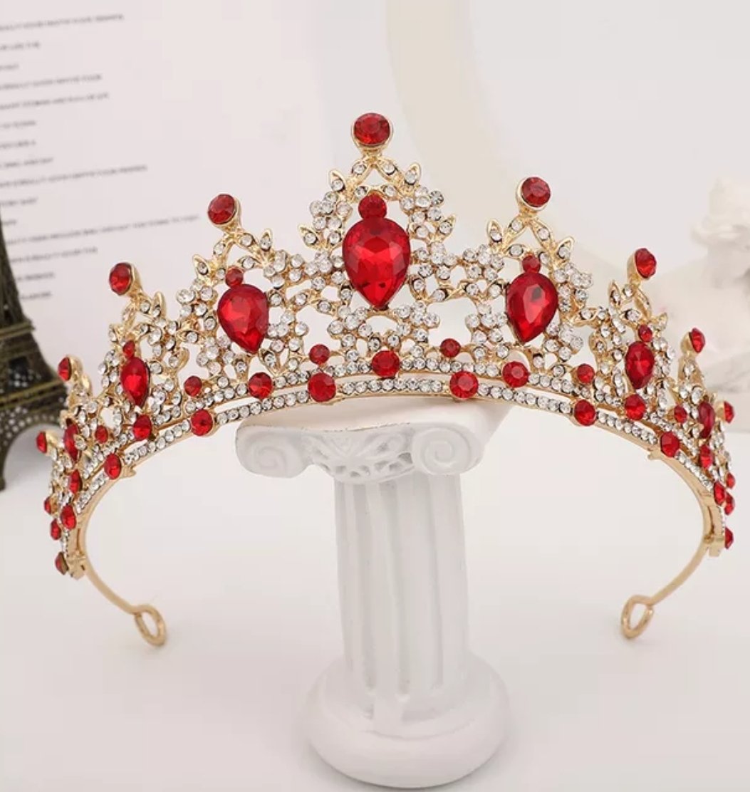 tiara y collar con aretes base dorada con toques rojos, material fantasía fina con incrustacion de cristales checos, tiara 6cm de alta