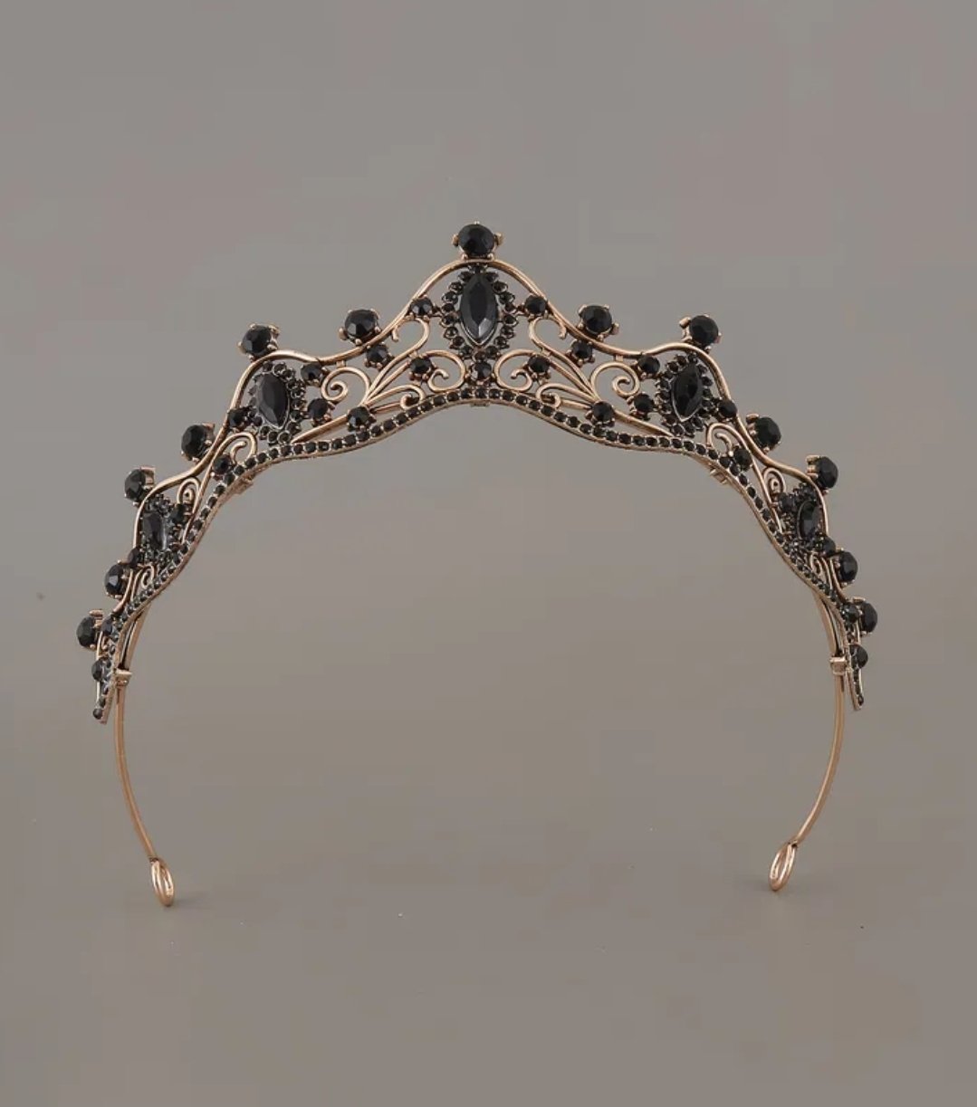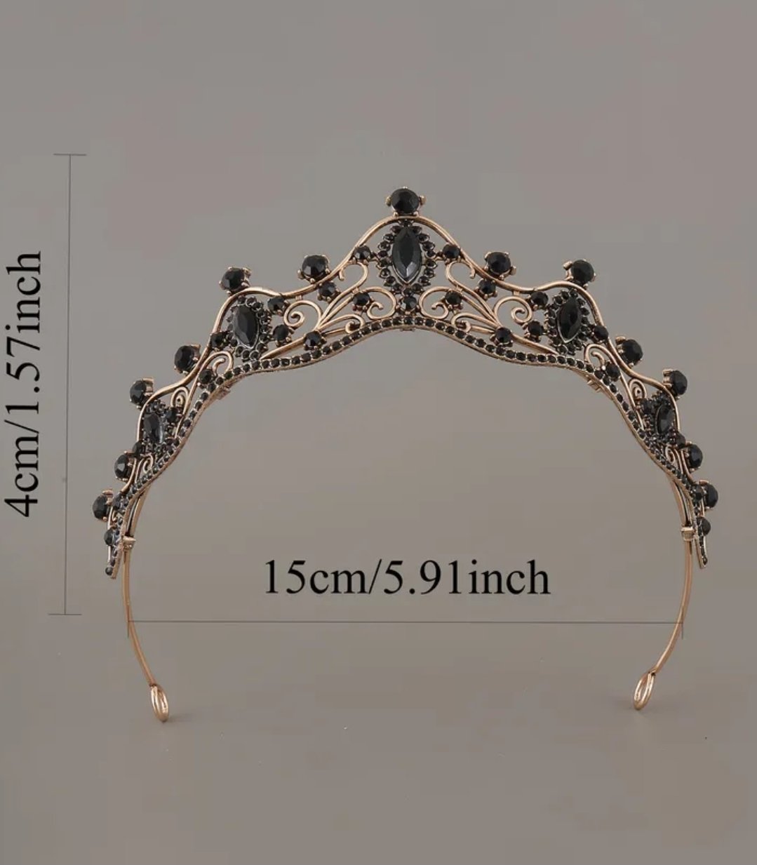 tiara dorada con toques negro, material fantasía fina con incrustacion de cristales checos