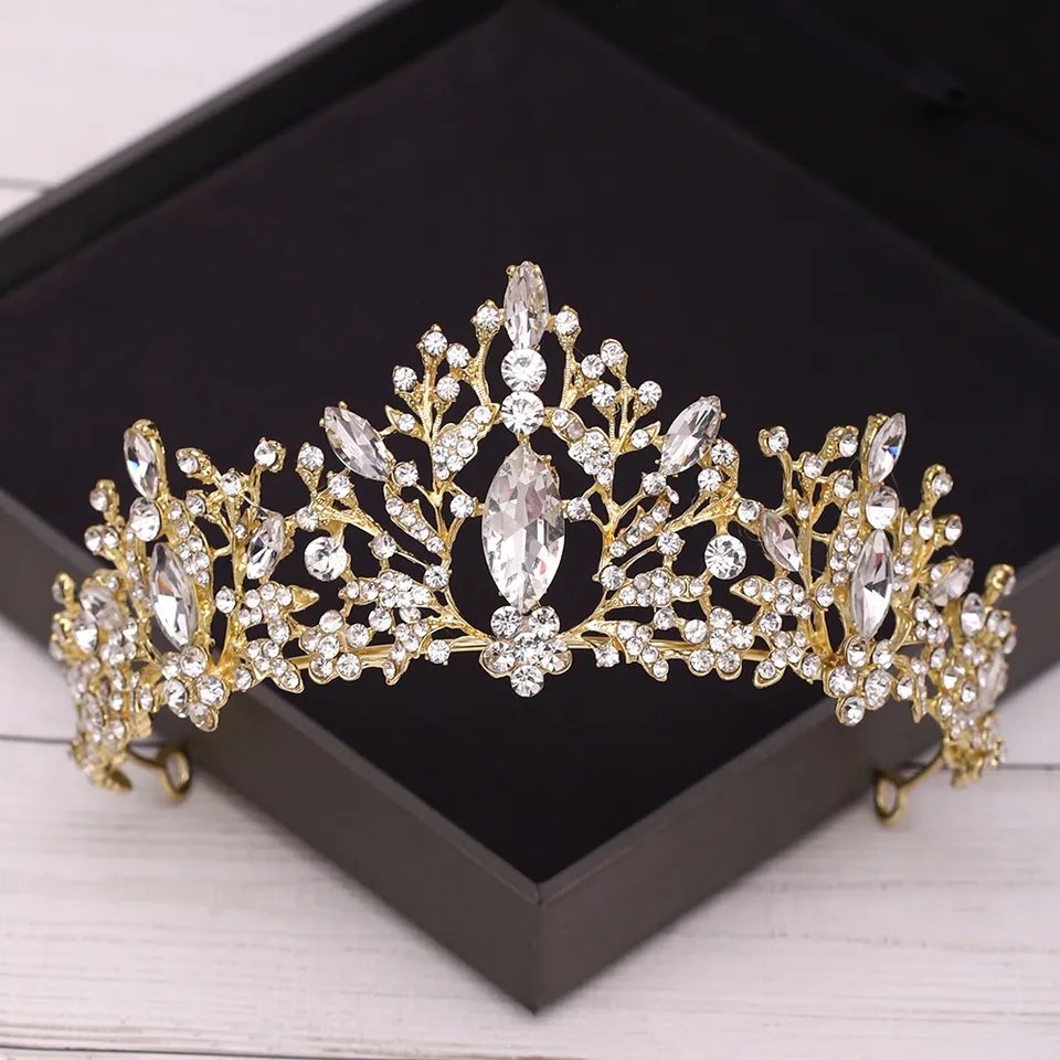 tiara dorada 6.5cm de alta, material fantasía fina con incrustacion de cristales checos