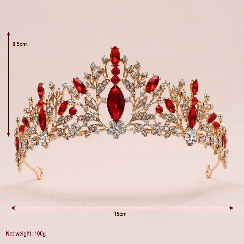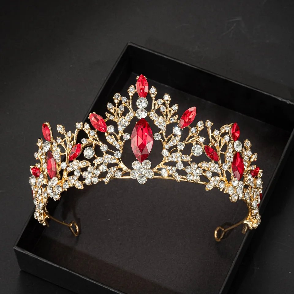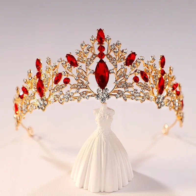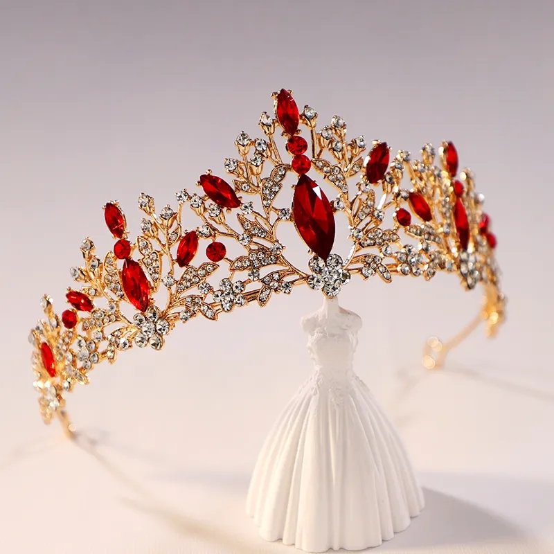tiara dorada con toques rojo, material fantasía fina con incrustacion de cristales checos