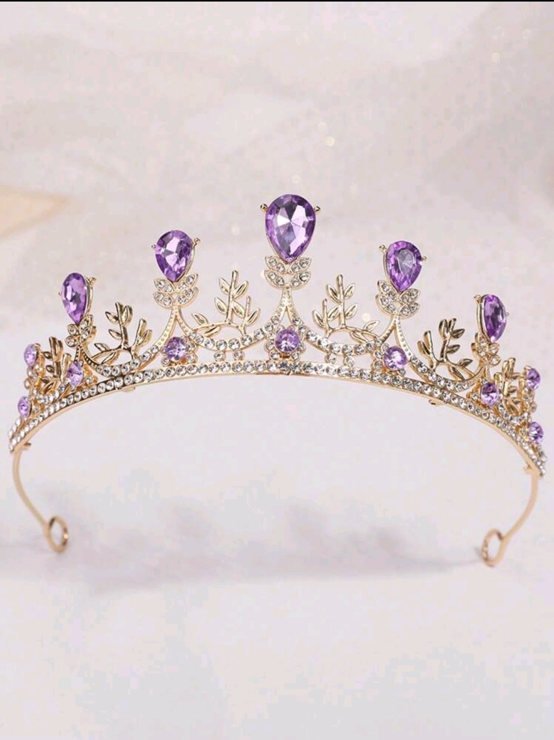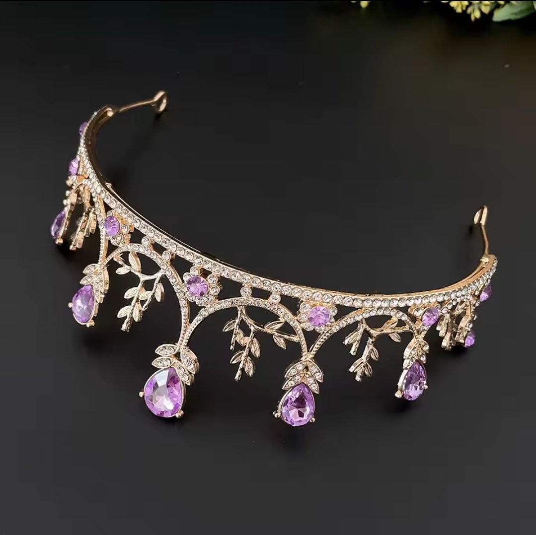 tiara base dorada con toques lila, material fantasía fina con incrustacion de cristales checos