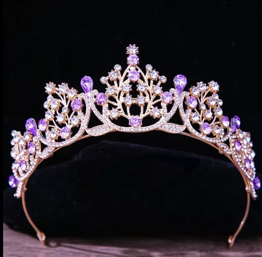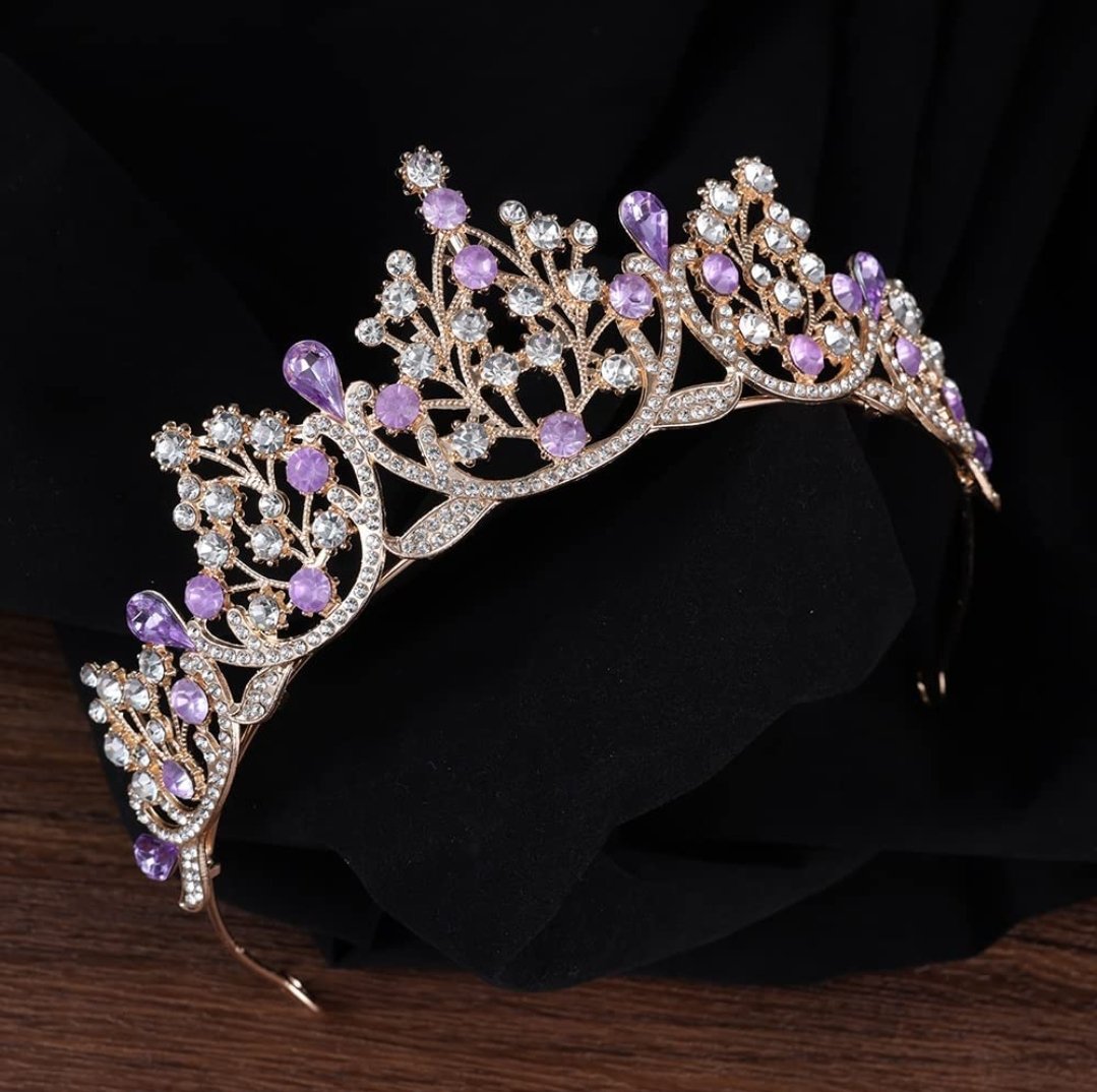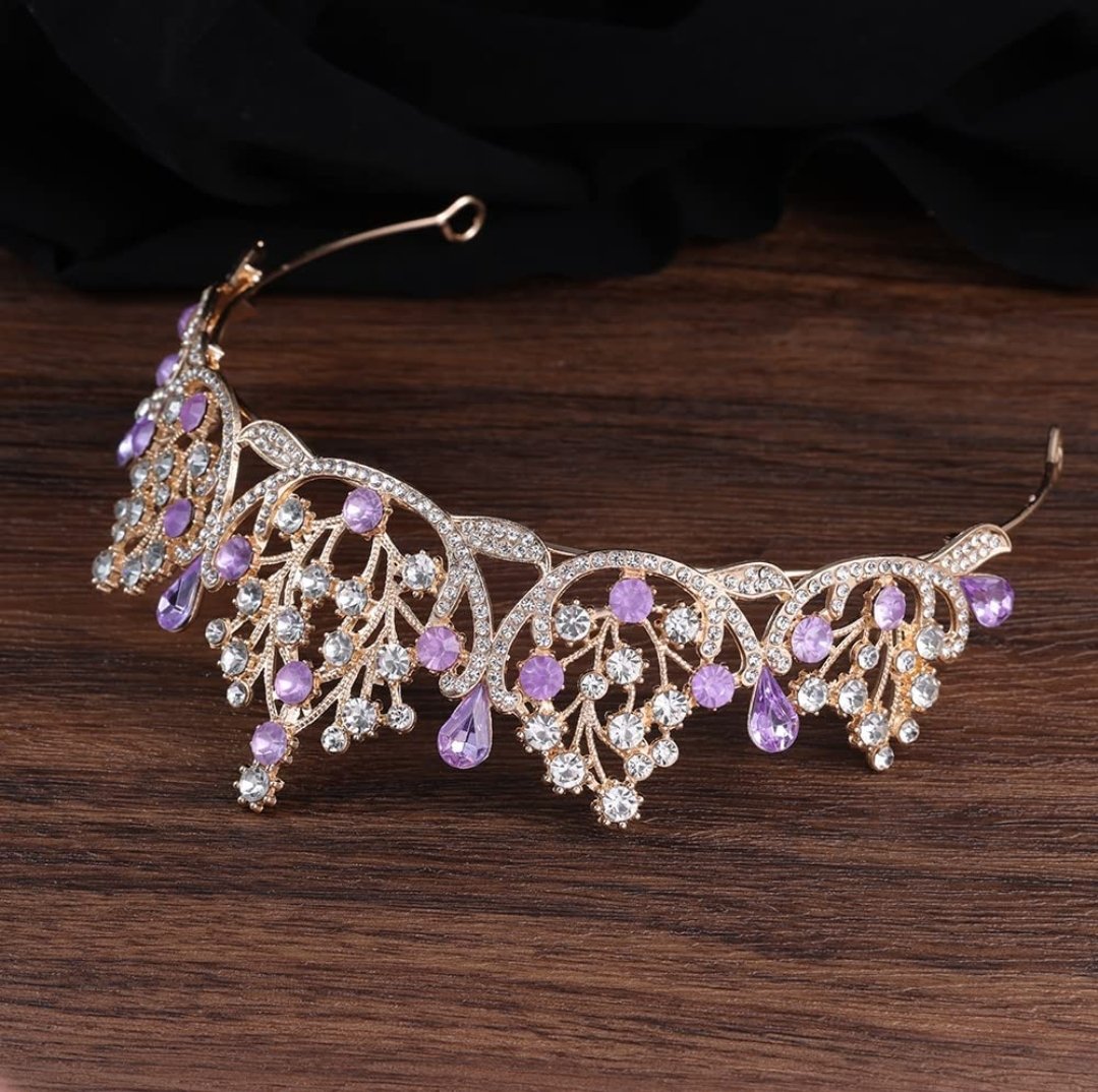 tiara base dorada con toques lila, material fantasía fina con incrustacion de cristales checos