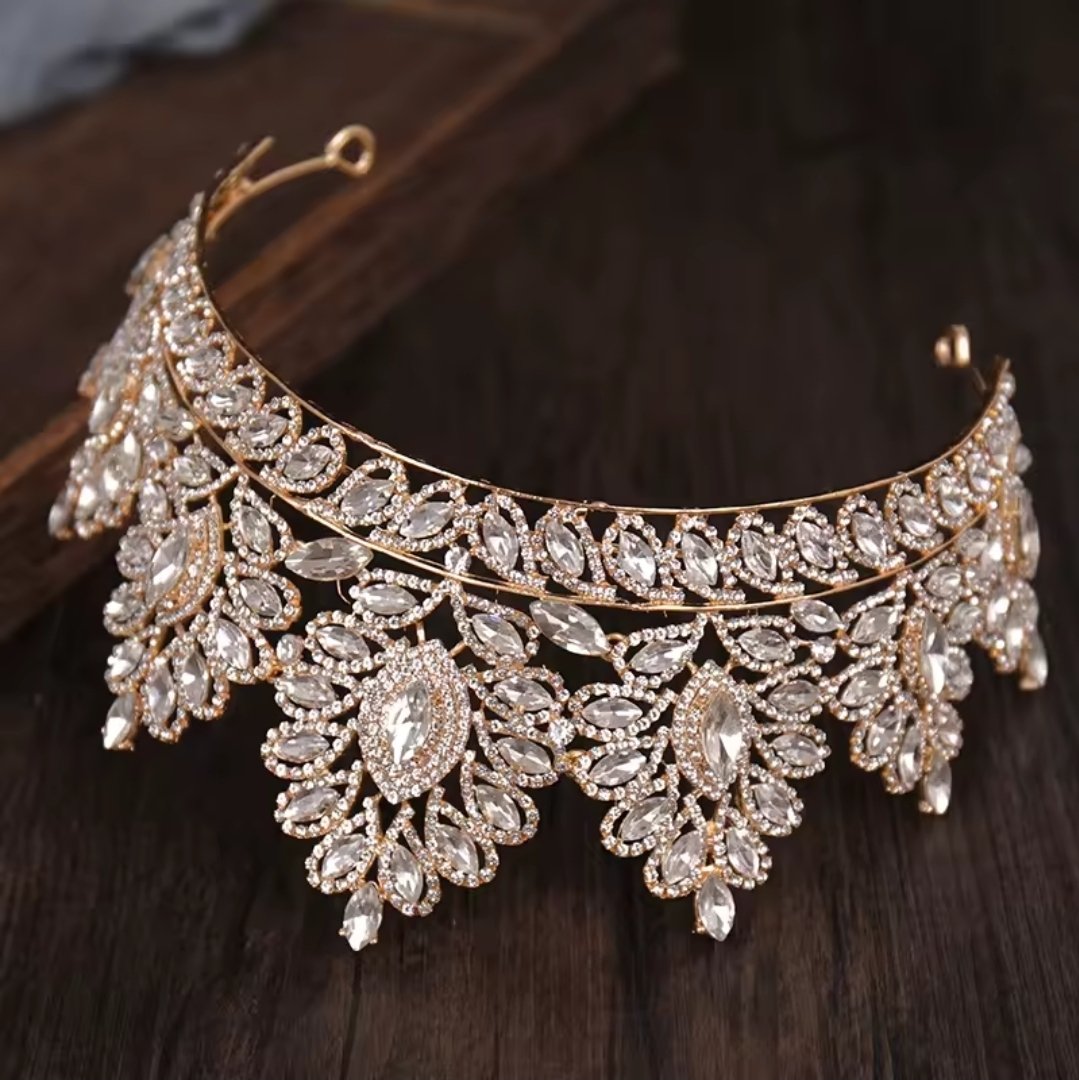 tiara base dorada, material fantasía fina con incrustacion de cristales checos 8cm de alta