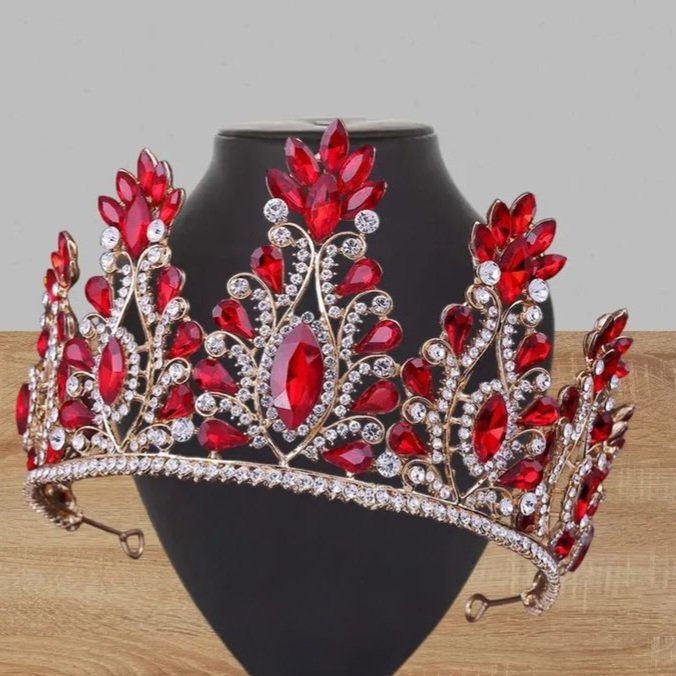 tiara dorada con toques rojo, material fantasía fina con incrustacion de cristales checos, 9.5cm de alta.