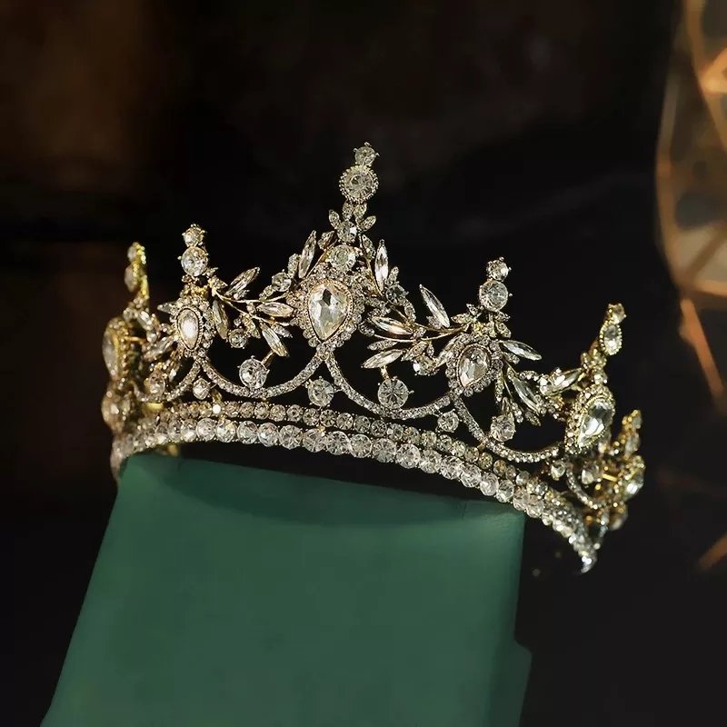 tiara dorada 8cm de alta, material fantasía fina con incrustacion de cristales checos