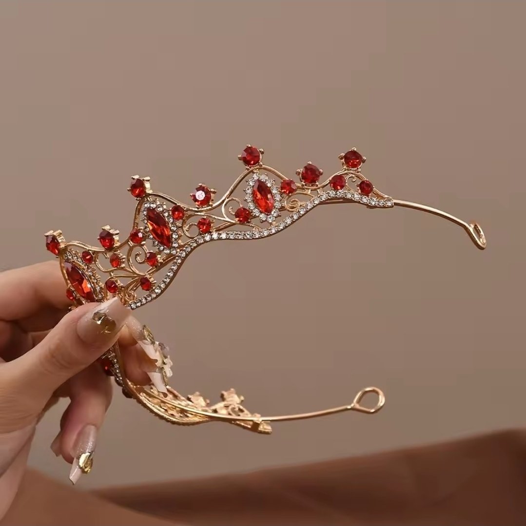 tiara dorada con toques rojo, 4.5cm de alta, material fantasía fina con incrustacion de cristales checos