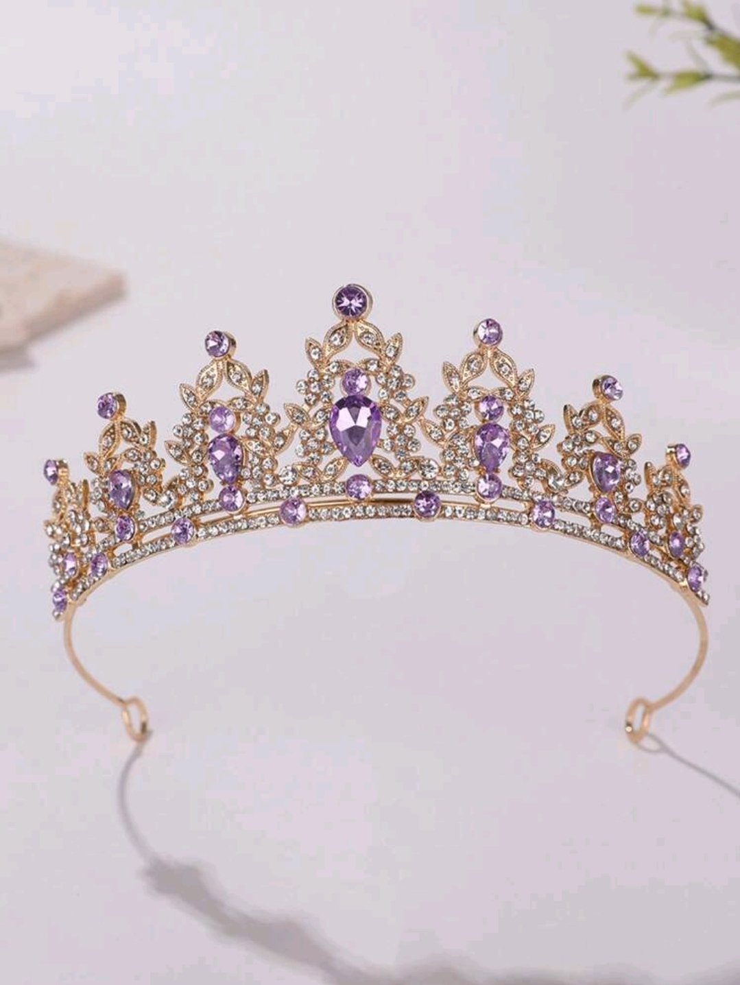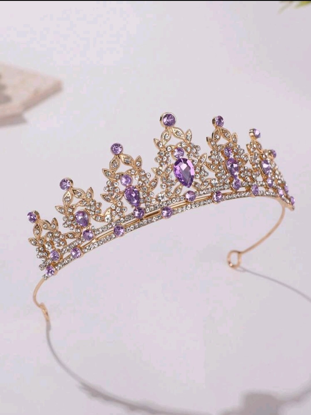 tiara base dorada con cristales lila, 6cm de alta, material fantasía fina con incrustacion de cristales checos