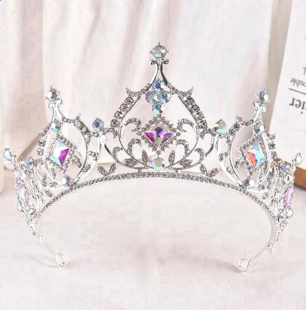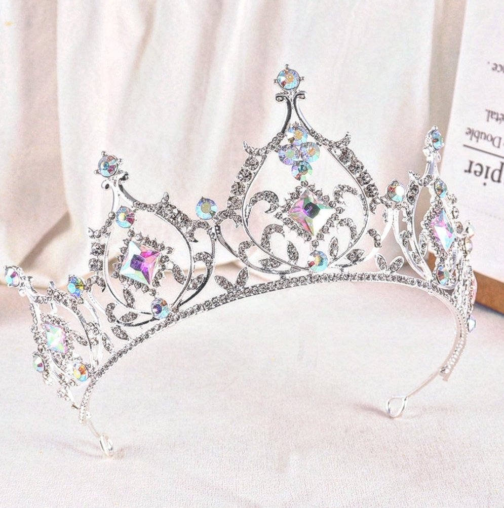 tiara base plateada con toques tornasol 7cm de alta, material fantasía fina con incrustacion de cristales checos
